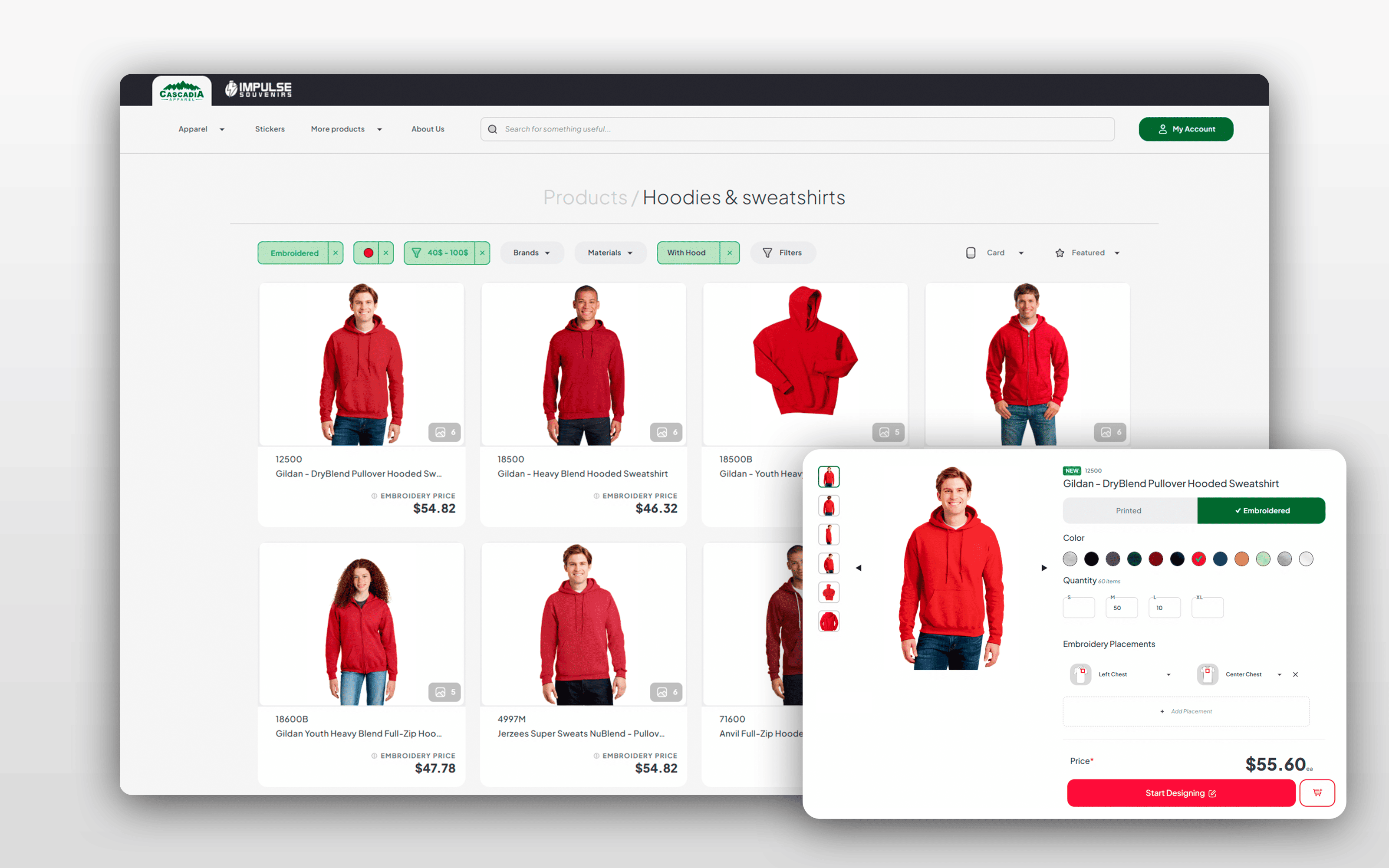 We rebuilt the legacy artwork editor as a modern web application using React and ASP.NET. Through a real-time vector editor, customers can upload or create artwork, see it on apparel mockups, and finalize designs before ordering. On the production side, the system handles the heavy lifting around artwork preparation — including vectorization, digitization, and approvals — so files reach the machines in a ready-to-use state.